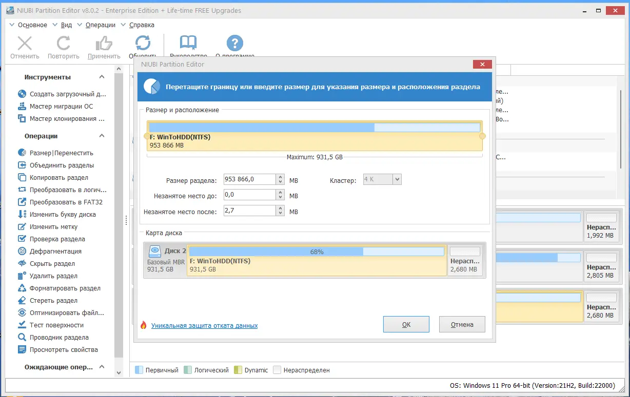 - Автоматическая дефрагментация при изменении размеров разделов для поддержания высокой производительности диска.
