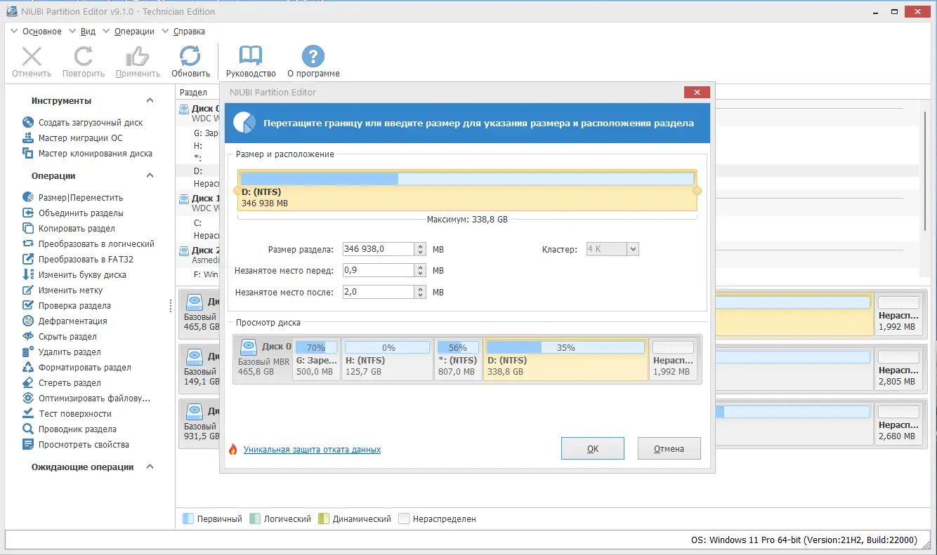 Интерфейс программы интуитивно понятен: все действия отображаются на графической схеме дисков, что упрощает визуальное восприятие. Пользователь может изменять размер раздела, перетаскивая границы, или через контекстное меню. Перед выполнением операций формируется очередь задач, которые можно отменить до применения. Это особенно полезно при сложных манипуляциях с системным диском. Программа поддерживает работу с динамическими томами и позволяет расширять раздел NTFS без перезагрузки, сохраняя активность системы. Поддержка портативной версии даёт возможность запускать утилиту с флешки, не устанавливая её на компьютер. Это удобно для диагностики и восстановления систем в аварийных ситуациях.