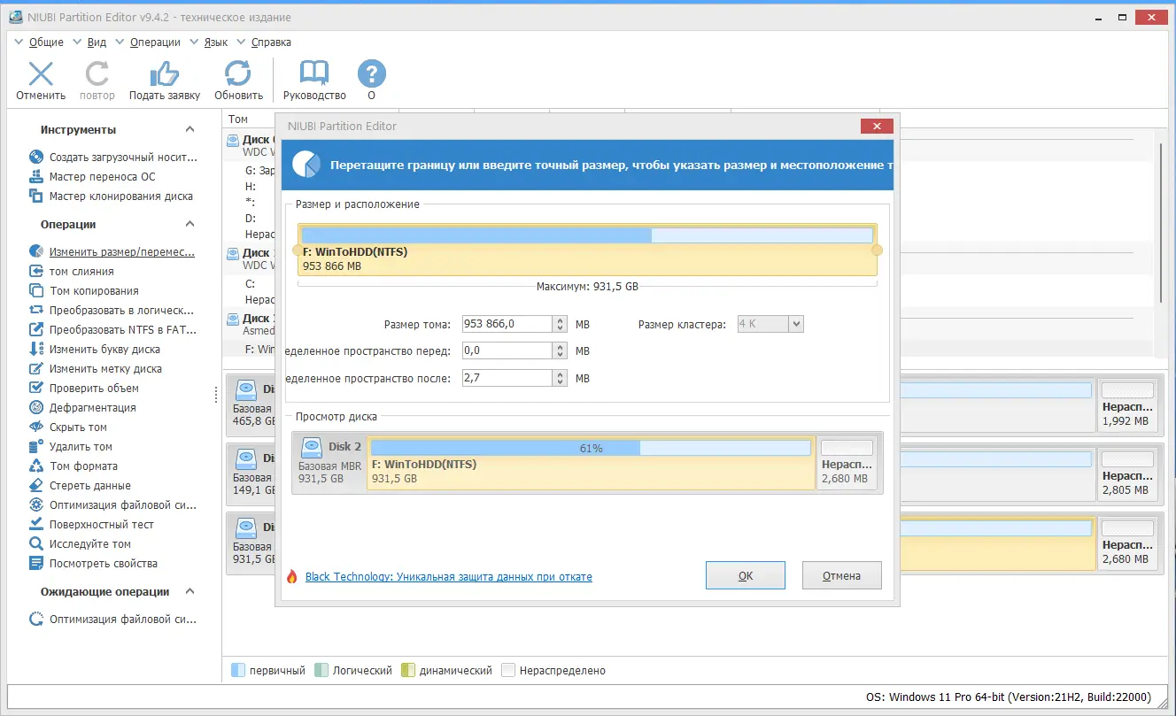 - Изменение размера и перемещение разделов без потери данных