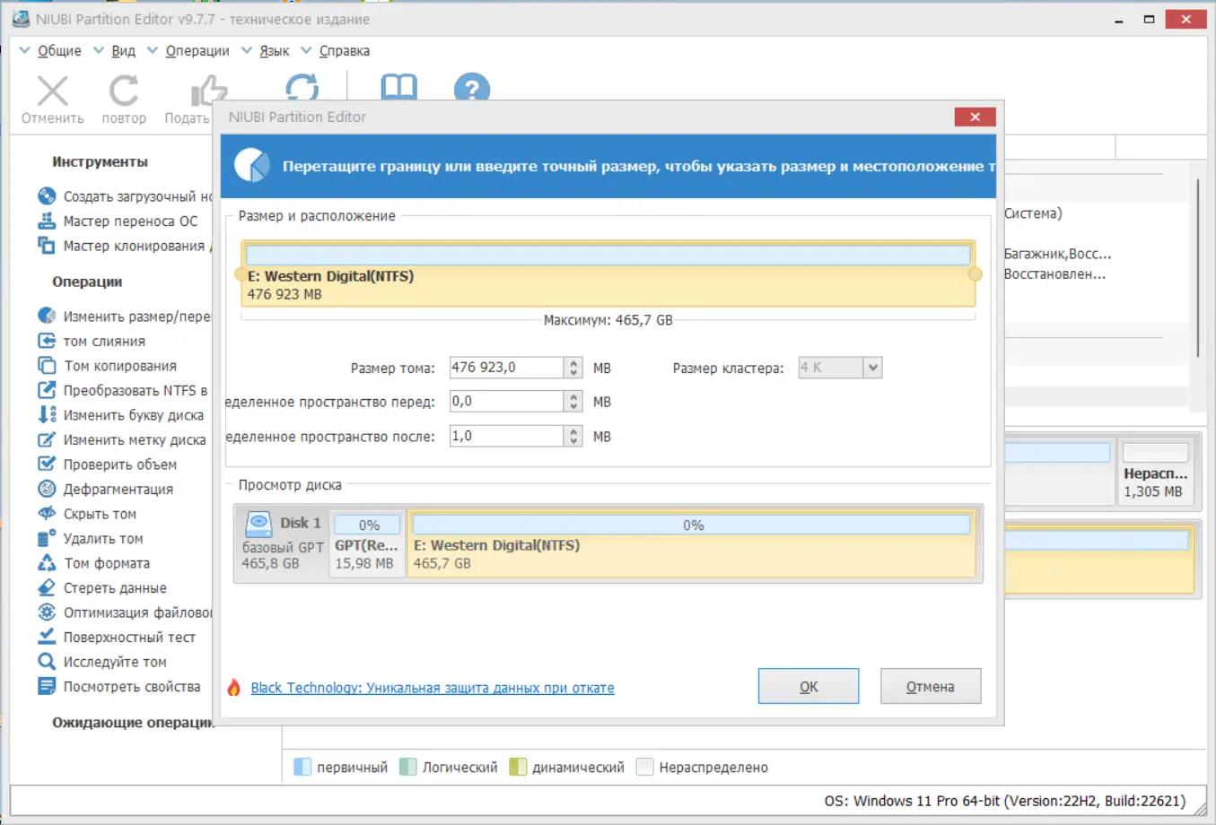 - Изменение размера и перемещение разделов без потери информации