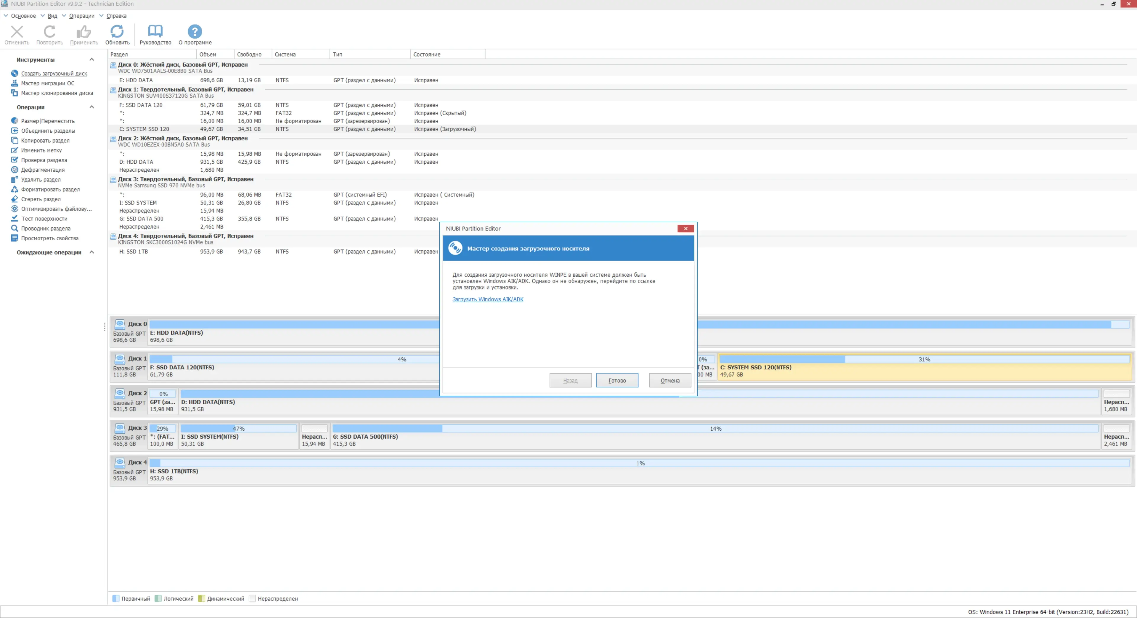 - Поддерживается создание загрузочного USB-носителя или диска CD/DVD для управления разделами вне работающей системы.