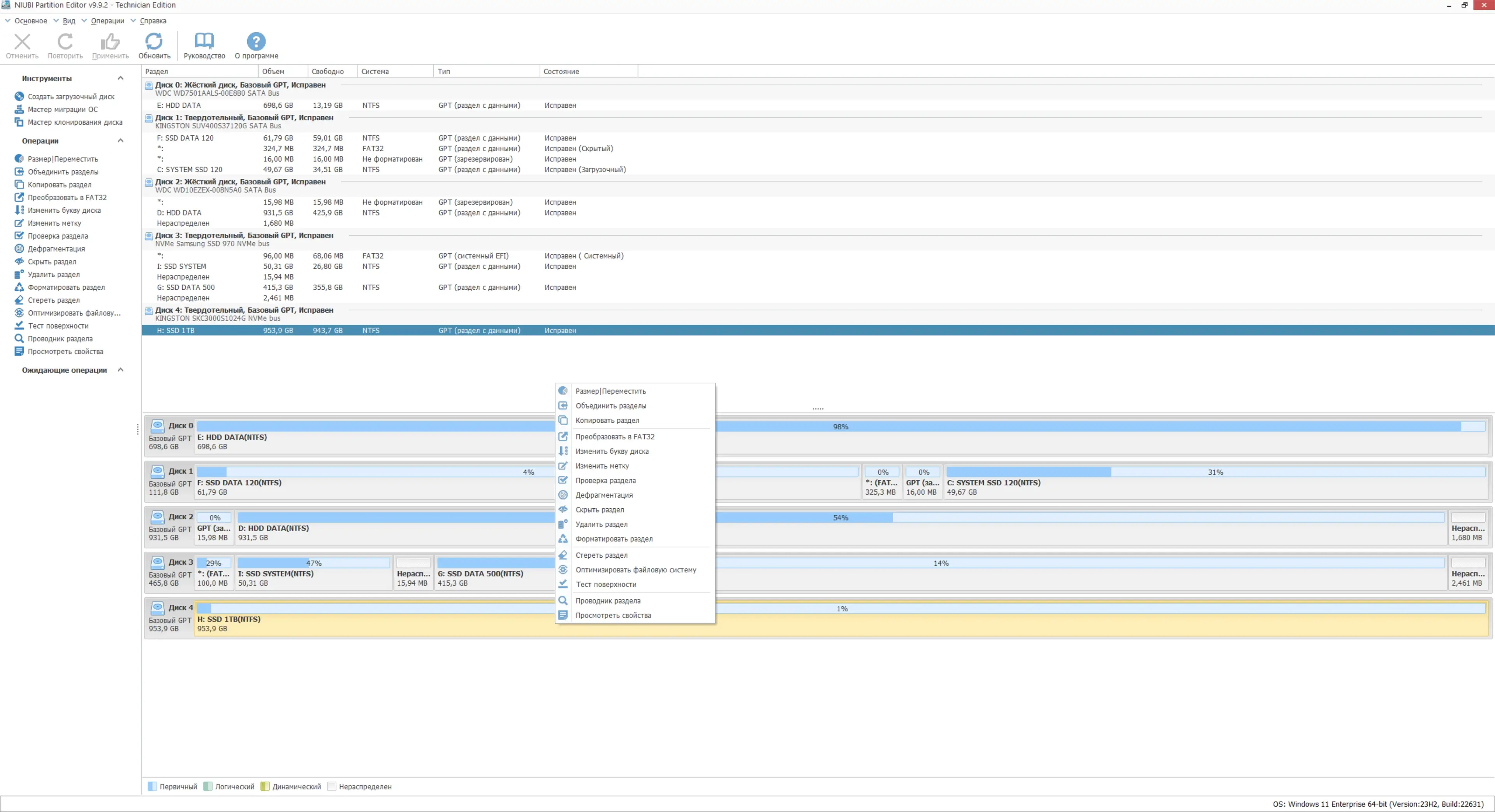 Интерфейс программы интуитивно понятен: все действия выполняются через графическое окно с визуальным отображением разделов. Пользователь может изменить размер тома, просто перетащив границу, или использовать контекстное меню для форматирования, скрытия или активации раздела. Перед применением любых изменений система показывает предварительный просмотр, что исключает случайные ошибки. Все операции можно добавлять в очередь и отменять до финального подтверждения.