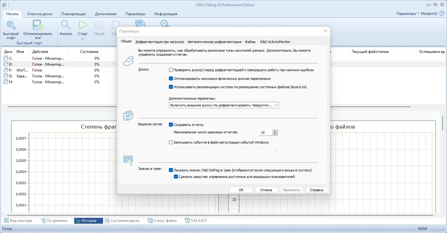 - Фоновый мониторинг дисков с мгновенным запуском процесса оптимизации при обнаружении фрагментации