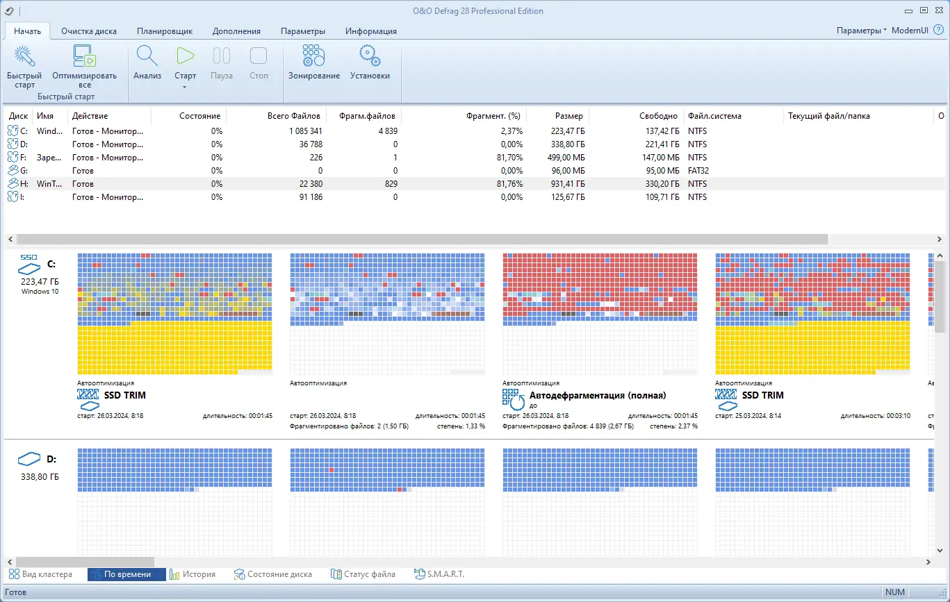 Интерфейс утилиты интуитивно понятен и поддерживает как классический, так и современный режим отображения. После установки система автоматически настраивается под текущее оборудование и режим использования. Пользователь может выбрать один из нескольких методов дефрагментации — от простого упорядочивания файлов до интенсивной оптимизации с перераспределением метаданных.