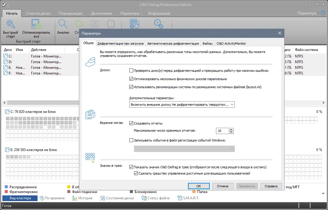 - Гибкие режимы дефрагментации, включая фоновую оптимизацию и приоритезацию часто используемых программ