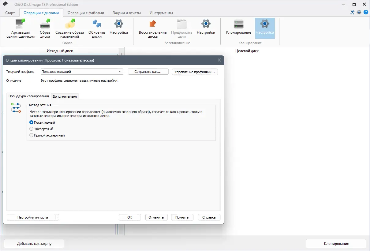 Резервное копирование происходит на уровне секторов, что гарантирует полную целостность данных, включая скрытые и системные файлы.