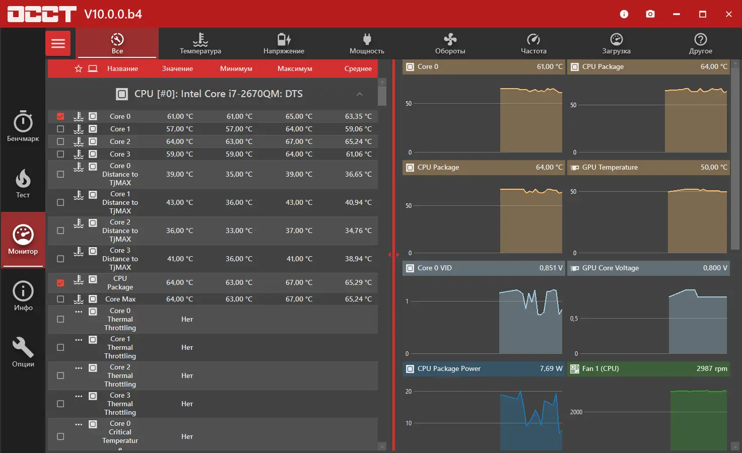 OCCT — это мощная утилита для тестирования стабильности работы компьютера, позволяющая проводить стресс-тесты процессора, оперативной и видеопамяти с детальным анализом результатов. Программа отображает данные в виде графиков, что упрощает оценку производительности и тепловых характеристик компонентов в ходе теста.