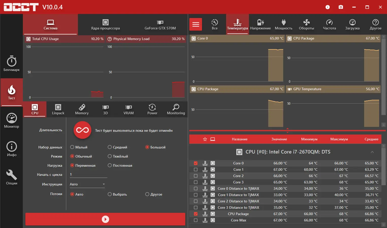 - Проведение стресс-теста центрального процессора с контролем температуры и напряжения