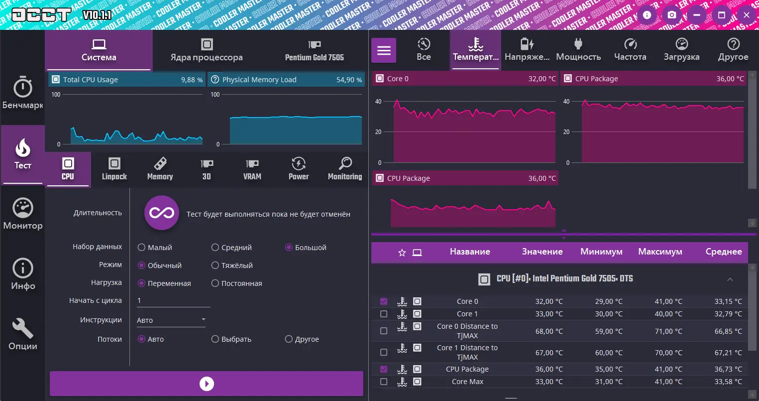 OCCT представляет собой специализированное программное обеспечение, предназначенное для проведения синтетических тестов компонентов персонального компьютера. Утилита помогает выявить нестабильность системы при интенсивной нагрузке, что особенно важно после разгона или установки нового оборудования. Программа поддерживает интеграцию с мониторинговыми инструментами, такими как SpeedFan и AIDA64, обеспечивая детальный контроль над температурой, напряжением и частотой компонентов. Версия OCCT Perestroika позволяет проводить параллельное тестирование процессора и оперативной памяти, а также отдельные проверки каждого из этих компонентов. Интерфейс доступен в двух темах оформления — стандартной и Coolermaster, что позволяет выбрать наиболее удобный внешний вид.