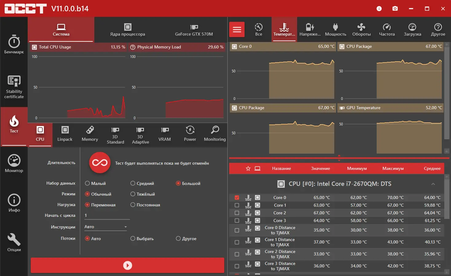 - Мониторинг температуры и напряжения компонентов во время теста с использованием сторонних приложений