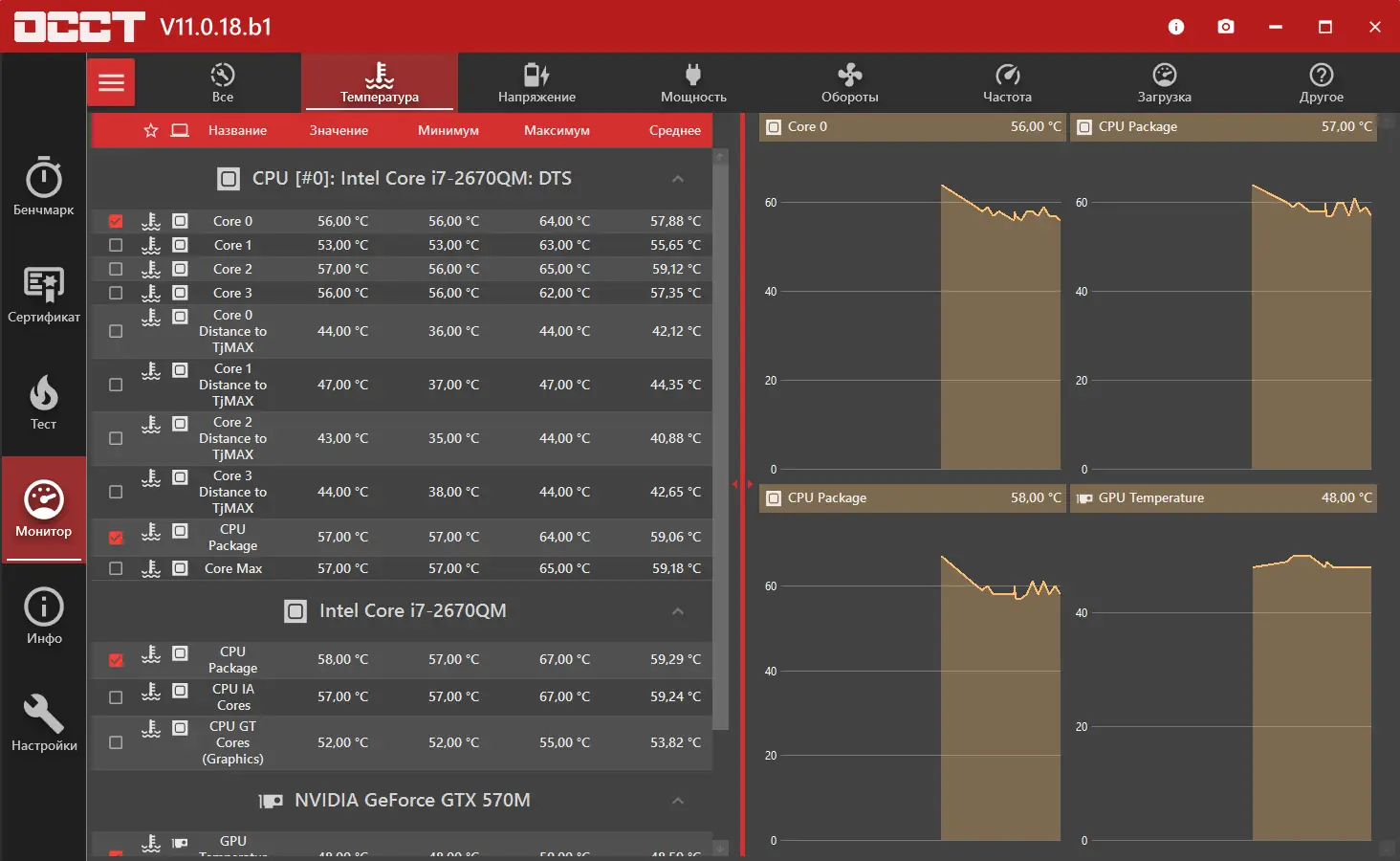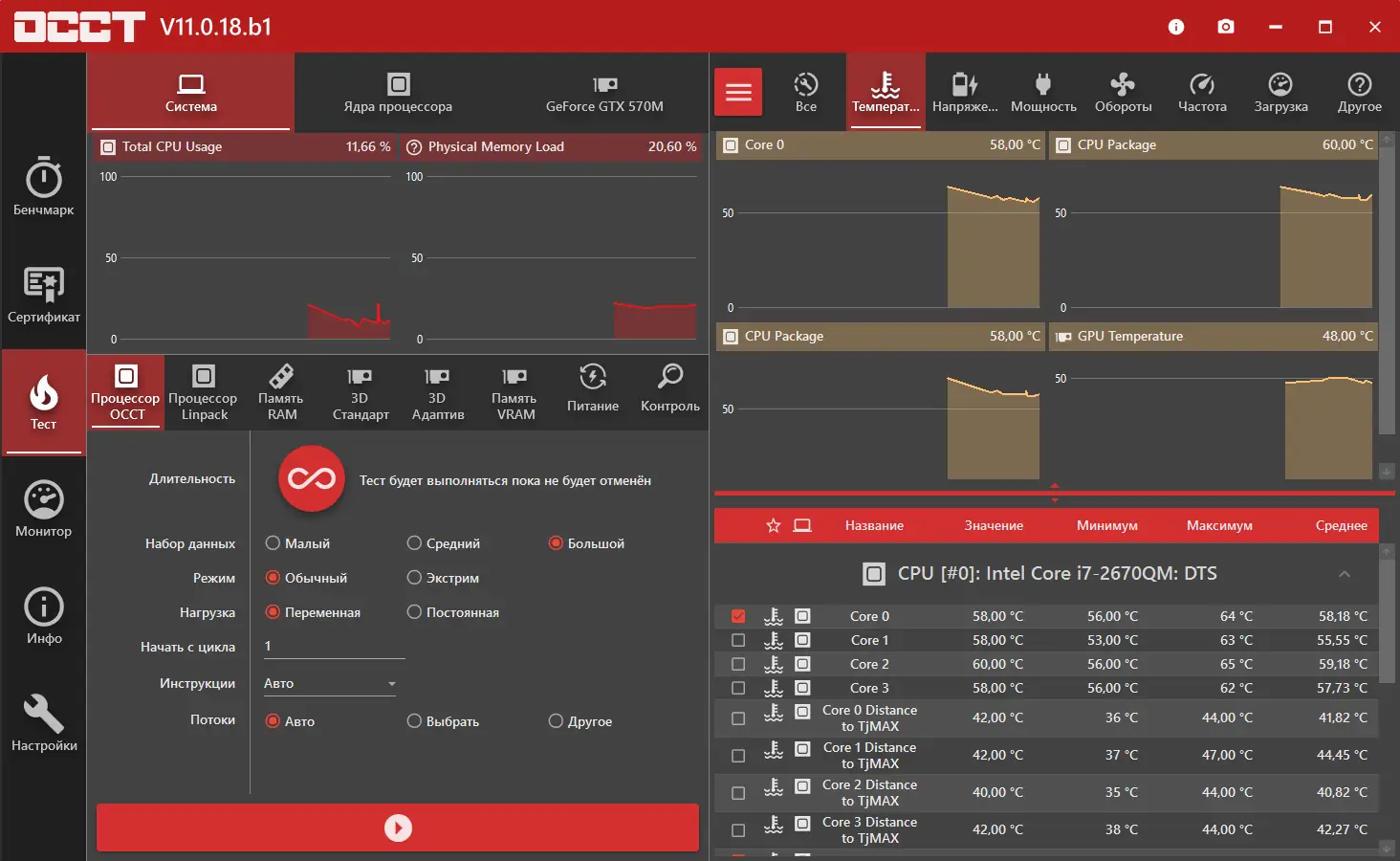 OCCT — это инструмент для синтетического тестирования ключевых компонентов компьютера, разработанный с акцентом на точность и детализацию. Утилита способна проводить комплексные проверки, включая парное тестирование процессора и памяти, а также отдельные нагрузки на CPU и RAM. Программа совместима с современными многоядерными процессорами и поддерживает последние версии операционных систем Windows, обеспечивая стабильную работу в различных конфигурациях. Интеграция с мониторинговыми приложениями, такими как SpeedFan и AIDA64, позволяет отслеживать температуру, напряжение и частоту в реальном времени. Результаты каждого прохода теста сохраняются в виде графиков, что помогает выявить отклонения и спрогнозировать долговечность системы. Важно помнить, что перед началом теста убедитесь в наличии чистоты в системе охлаждения.