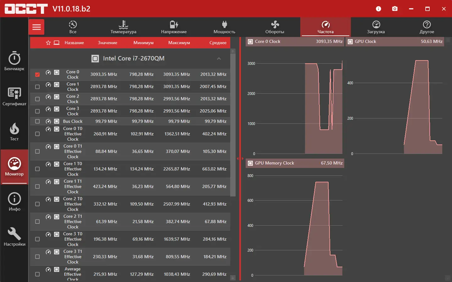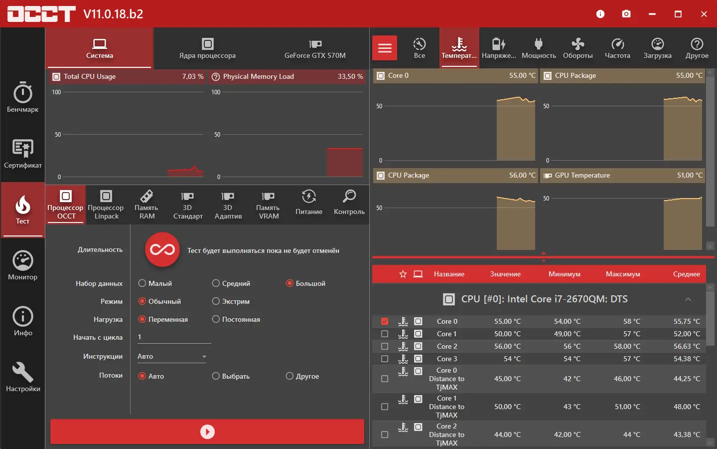 OCCT — это мощная система тестирования, предназначенная для проверки стабильности работы компьютера под высокой нагрузкой. Программа проводит комплексные стресс-тесты, охватывающие центральный процессор, оперативную память и графический ускоритель. Результаты отображаются в виде детализированных графиков, что позволяет точно оценить поведение компонентов в ходе теста.