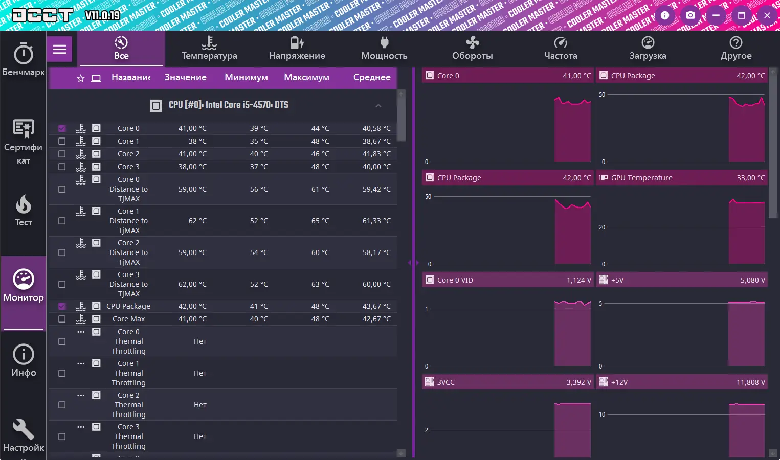 - Отображает динамику температуры, напряжения и частоты в реальном времени.
