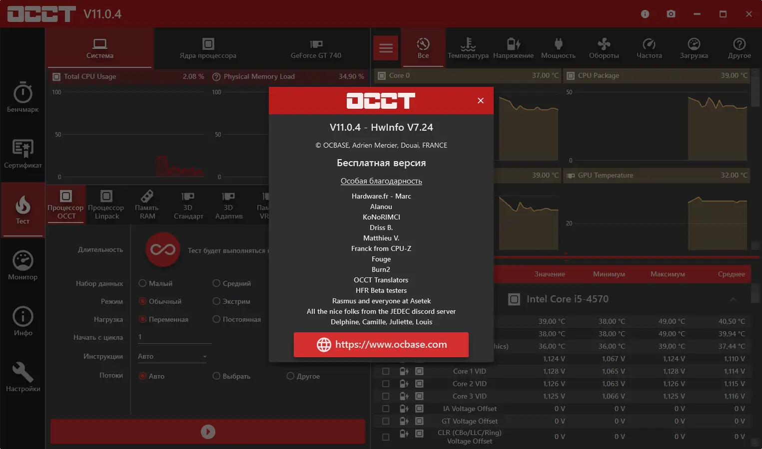 OCCT — это утилита, разработанная для проведения стресс-тестов, которая помогает оценить надёжность и производительность ключевых компонентов компьютера. Программа поддерживает многоядерные процессоры и работает на современных версиях Windows, обеспечивая совместимость и стабильность. Пользователи могут проводить тест процессора и оперативной памяти как в парном режиме, так и по отдельности, что позволяет точнее локализовать источник нестабильности. Результаты каждого прохода теста выводятся в виде графиков, отражающих изменения температуры, напряжения и частоты. Это делает анализ поведения системы под нагрузкой максимально прозрачным и информативным.