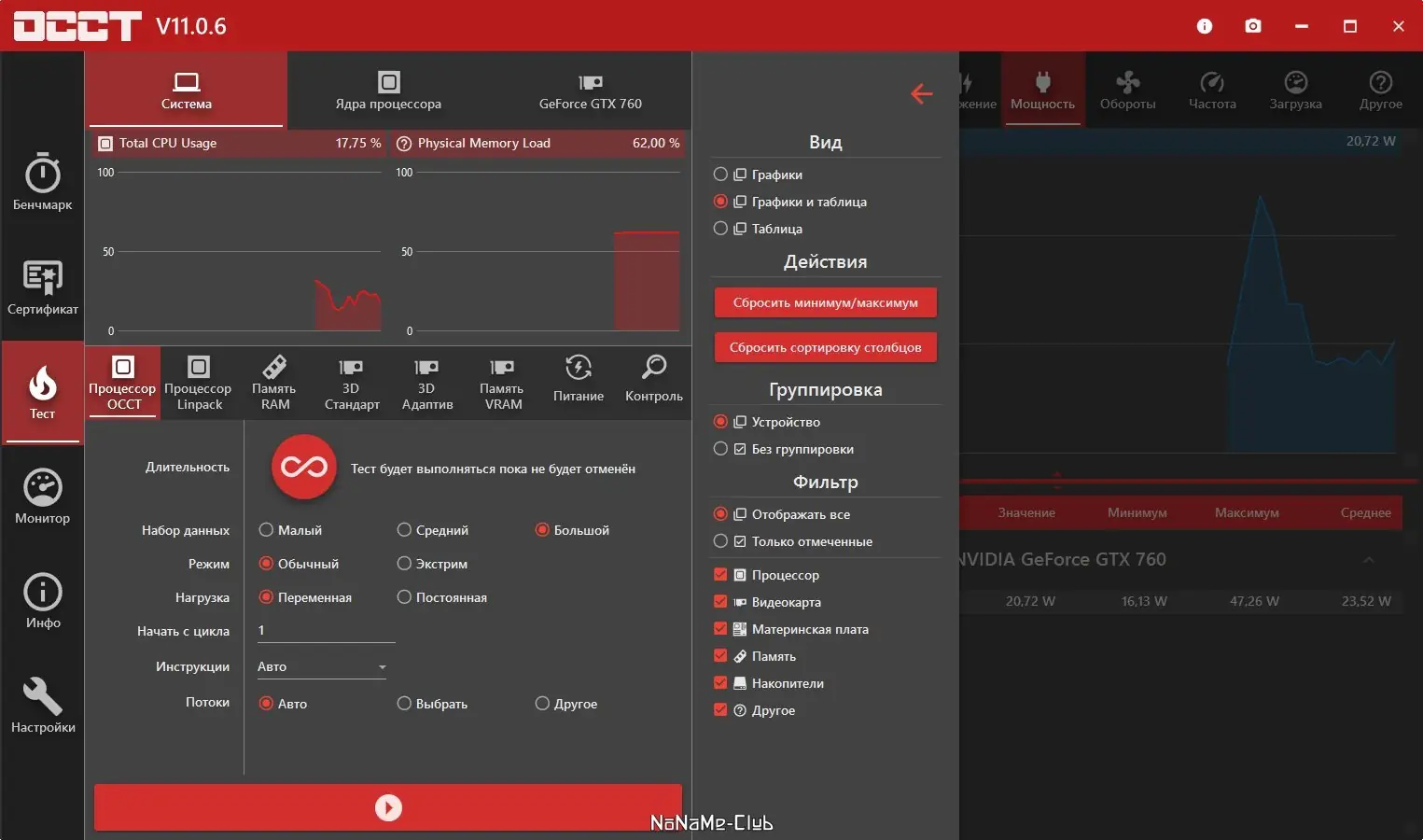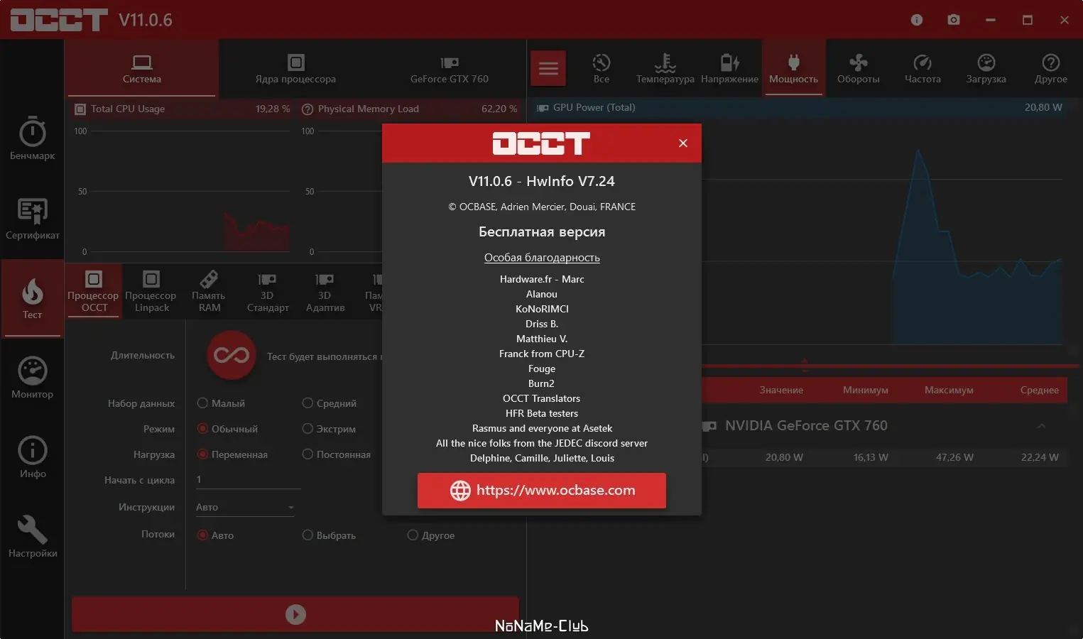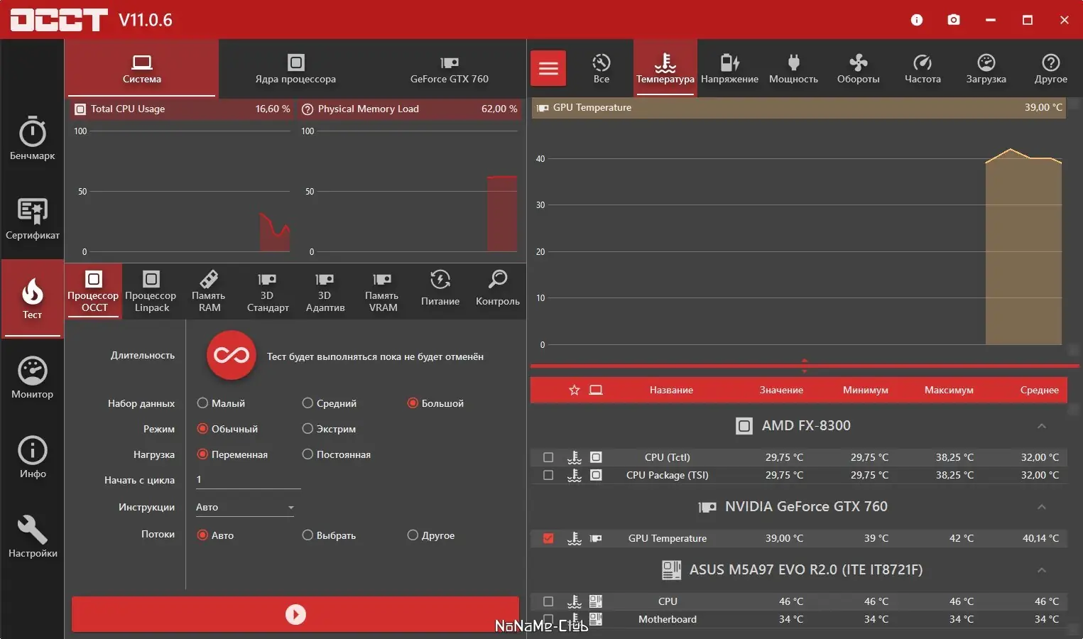 OCCT — это мощная утилита для тестирования стабильности работы компьютера, ориентированная на выявление сбоев в работе центрального процессора, оперативной и видеопамяти под высокой нагрузкой. Программа предоставляет детальные графики изменения температур, напряжений и производительности в ходе теста, что делает её незаменимой при разгоне или диагностике системных компонентов.