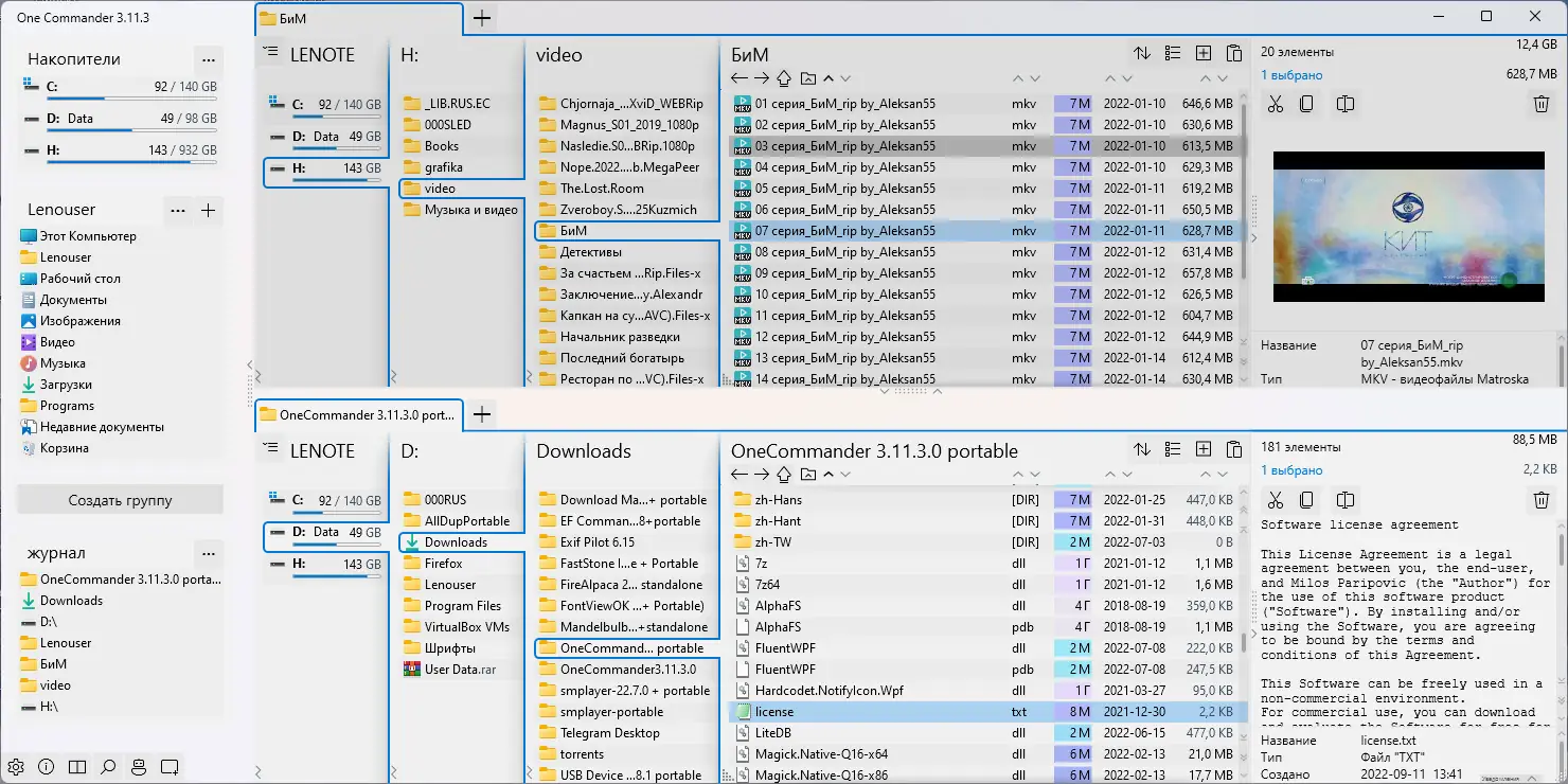 One Commander предлагает альтернативу стандартному проводнику Windows, пересматривая подход к работе с файловой системой. Вместо многочисленных окон используется двухпанельный интерфейс с поддержкой вкладок, что упрощает перемещение между каталогами. Навигация по столбцам напоминает поведение Finder в macOS, но адаптирована под логику Windows. Пользователь видит иерархию папок последовательно, без необходимости открывать отдельные окна. Встроенный предварительный просмотр позволяет оценить содержимое файлов без их запуска, включая изображения, документы и аудио. Система цветовых тегов помогает быстро выделять важные файлы, а отображение дат в относительном формате делает хронологию более понятной.