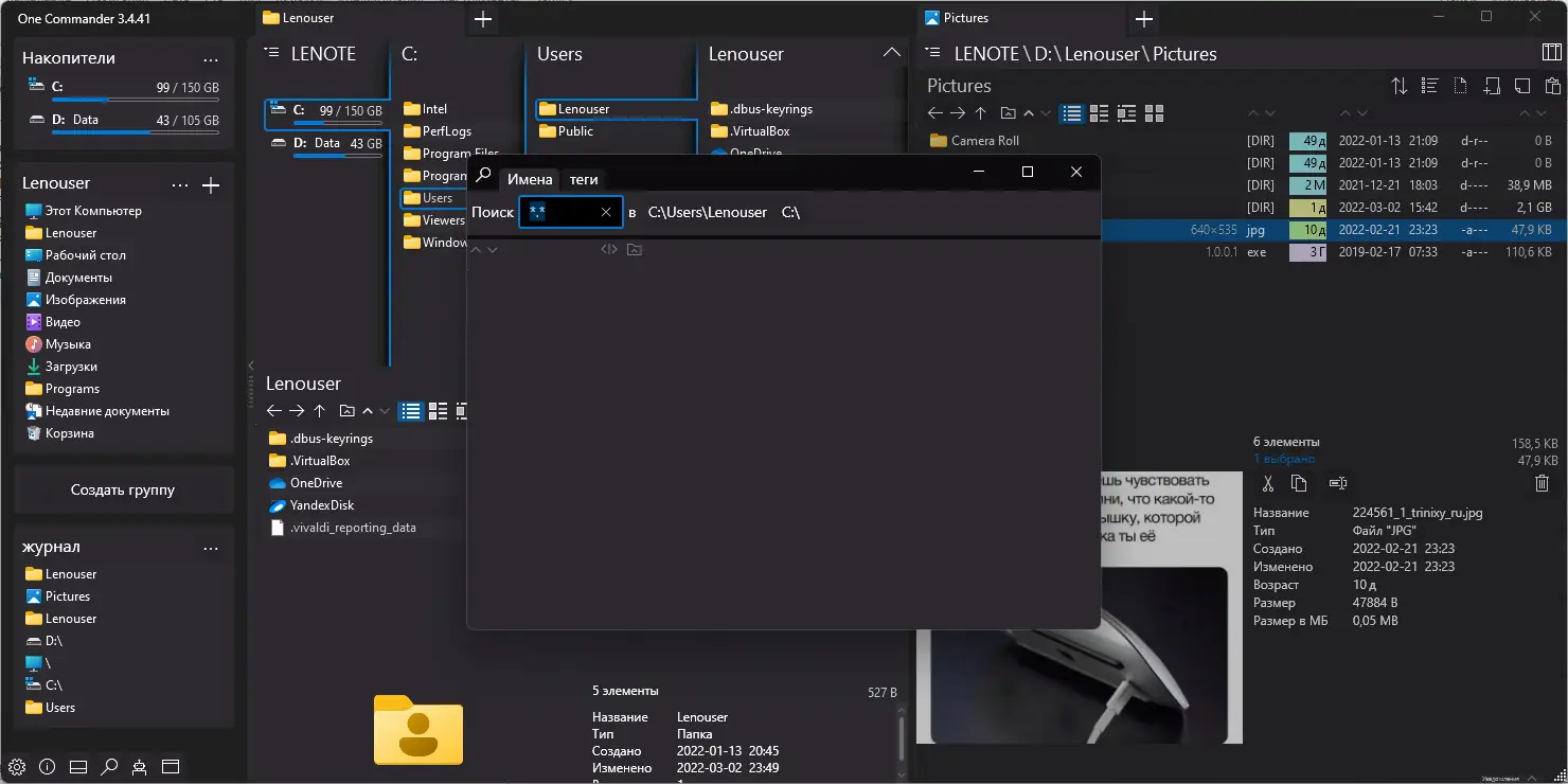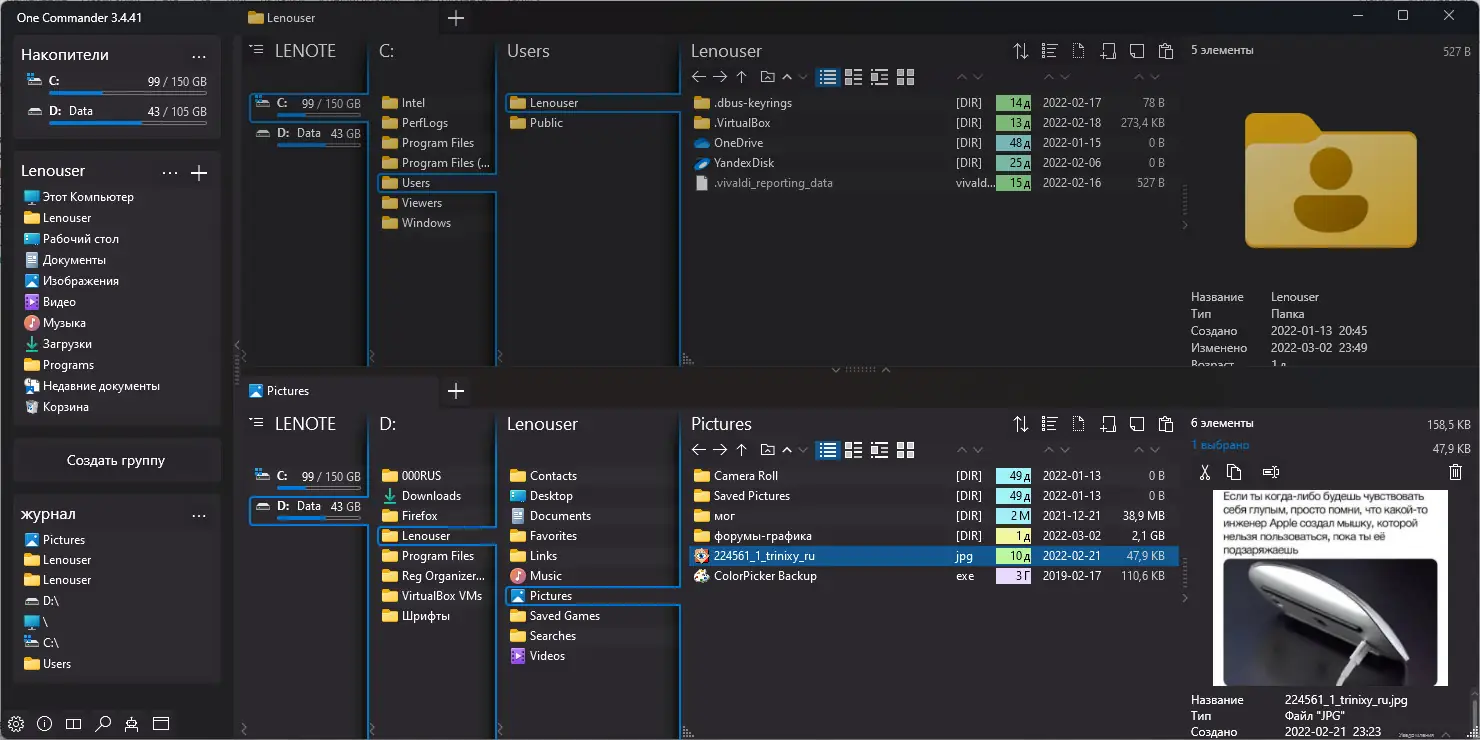 One Commander представляет собой альтернативу стандартному проводнику Windows, ориентированную на пользователей, ценящих скорость, гибкость и визуальную ясность. Интерфейс построен на двух панелях, между которыми можно мгновенно переключаться или одновременно просматривать разные директории. Поддержка вкладок позволяет организовать несколько рабочих пространств в одном окне, что особенно удобно при одновременной работе с файлами из разных разделов диска.