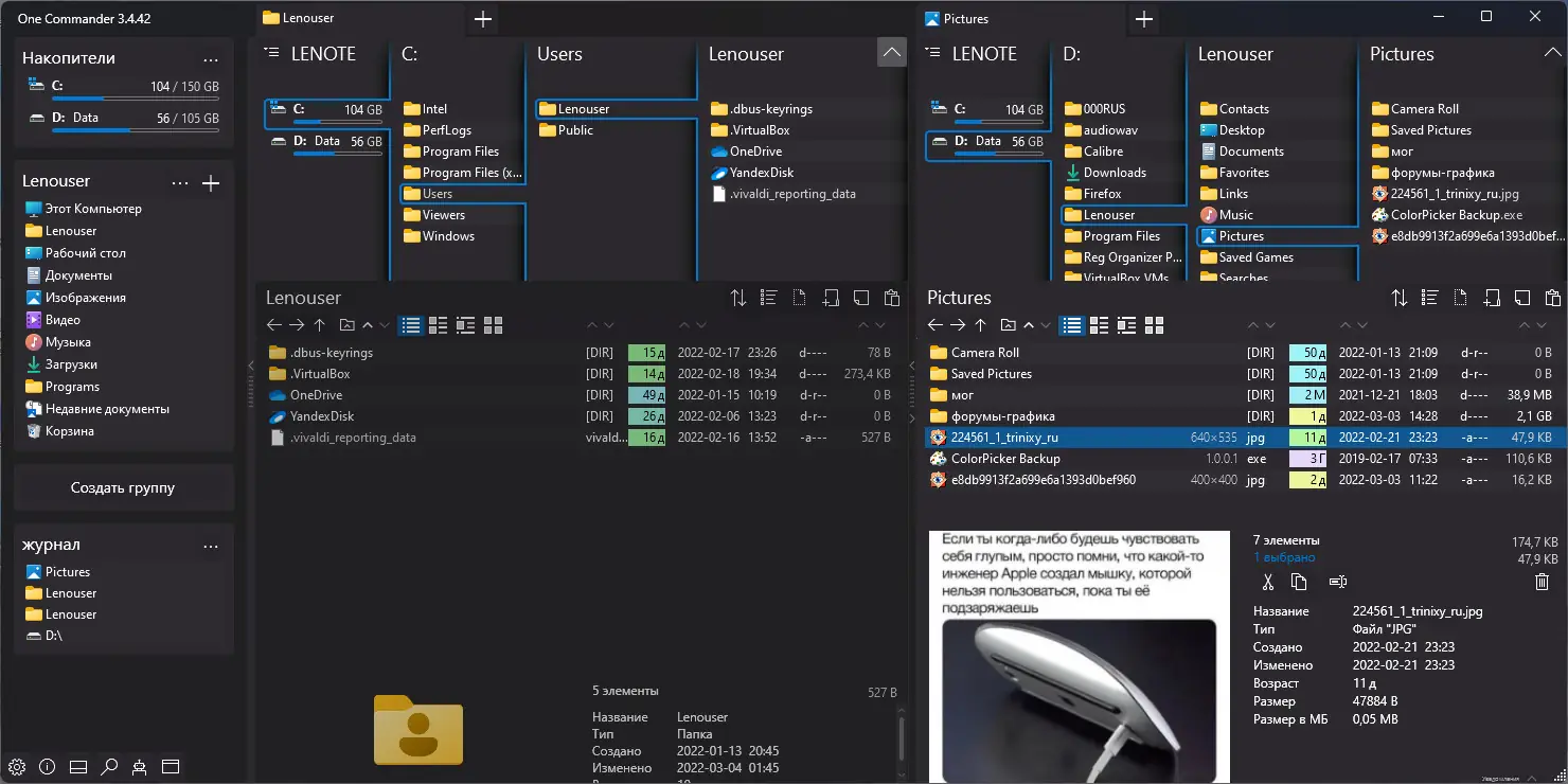 - Двухпанельный интерфейс с возможностью синхронной навигации между каталогами.