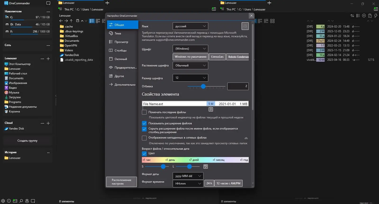 - Цветовое кодирование файлов по датам изменения и относительное отображение времени