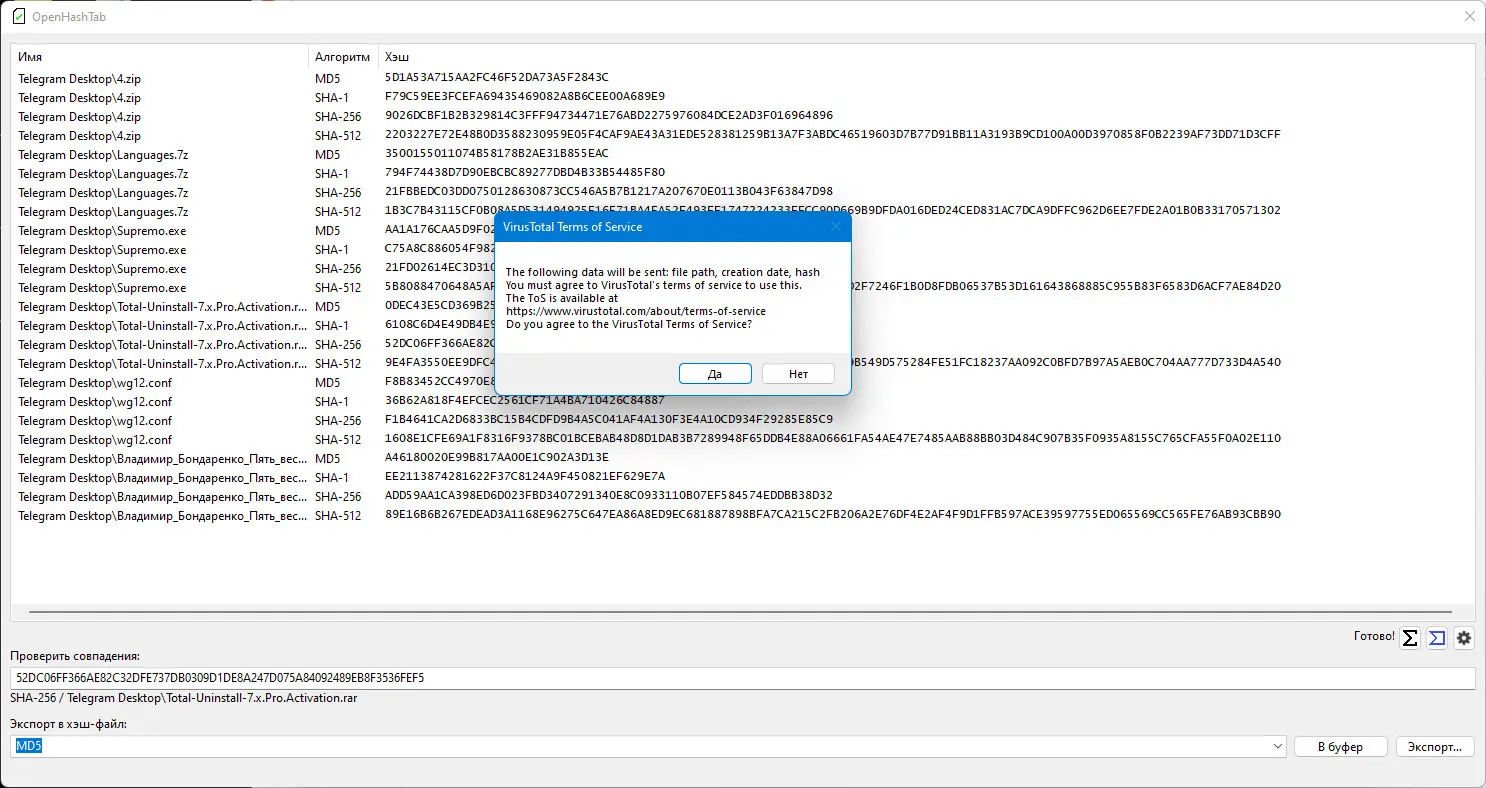 Использование OpenHashTab интуитивно понятно и не требует глубоких технических знаний. Достаточно щелкнуть правой кнопкой мыши по файлу или папке и выбрать пункт «Свойства», чтобы увидеть вкладку с хэшами. Программа автоматически вычисляет значения по всем включённым алгоритмам. Можно выбрать несколько файлов одновременно — утилита обработает каждый из них и отобразит результаты в виде таблицы. Для копирования хэша достаточно дважды щёлкнуть по его значению. Дополнительно доступны функции проверки по сторонним сервисам и сравнение с контрольными файлами. Поддержка длинных путей и многоязычный интерфейс делают работу комфортной в различных сценариях. Расширенные пользователи могут настраивать поведение через реестр, например, принудительно отключать интеграцию с VirusTotal или задавать предпочитаемый язык интерфейса.