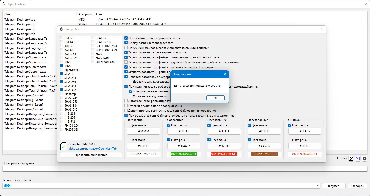- Широкий выбор алгоритмов, включая SHA-3, BLAKE3, Streebog и другие современные стандарты.