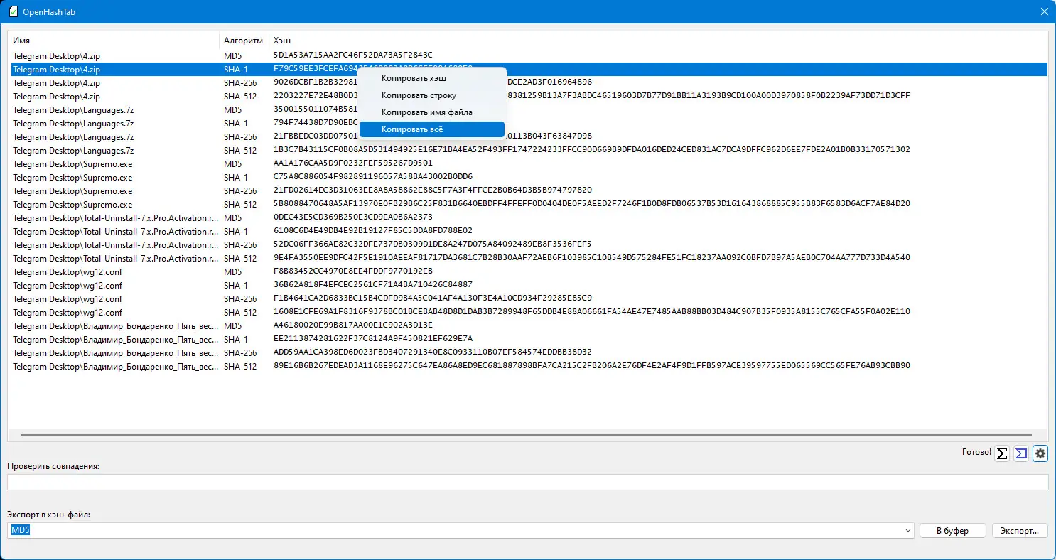- Гибкие возможности экспорта и проверки хэшей, включая работу с файлами контрольных сумм.