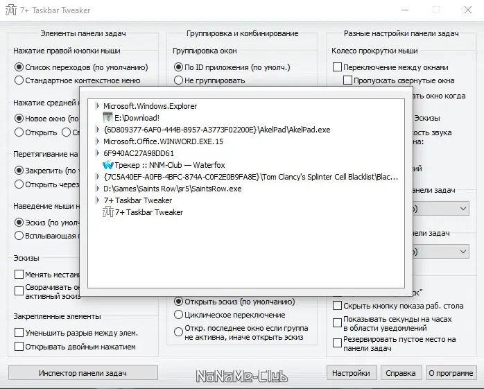 После запуска 7+ Taskbar Tweaker отображается небольшое окно с вкладками настроек. Основные параметры сосредоточены в центральной части интерфейса, где доступны переключатели, флажки и выпадающие списки. Для применения изменений не требуется перезагрузка системы — большинство опций активируются мгновенно. Расширенные настройки можно найти в разделе «Advanced», где отображаются параметры, влияющие на взаимодействие между функциями. Инспектор задач открывается отдельной командой и показывает дерево активных окон, позволяя перетаскивать элементы между группами или изменять их идентификаторы. Пользователь может назначать действия для средней кнопки мыши, настраивать скрытие панели или резервирование пространства под виджеты. Для портативного использования предусмотрен режим portable, который активируется при установке — в этом случае программа не оставляет следов в реестре и может запускаться с флешки.