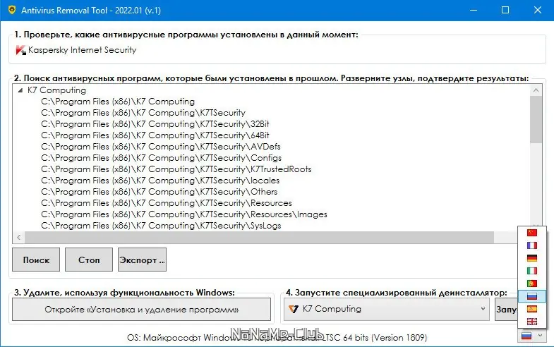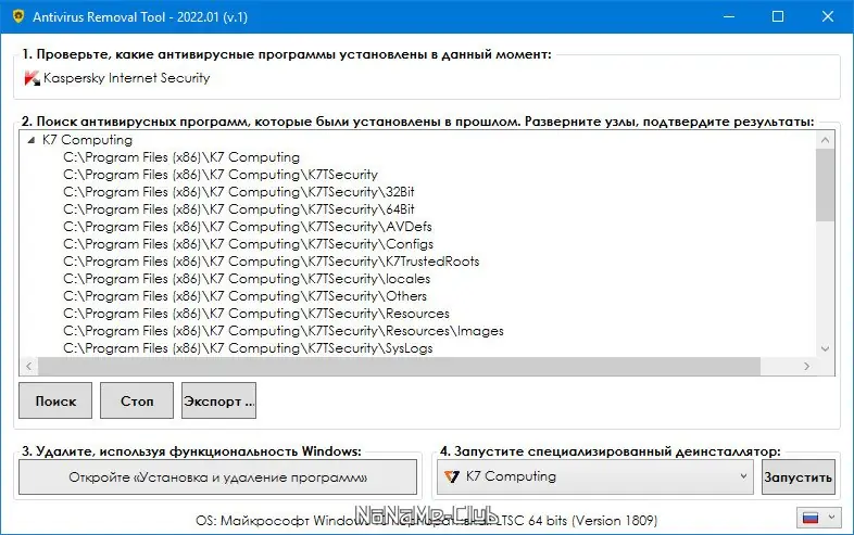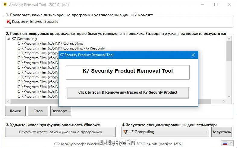 - Поиск и удаление следов ранее деинсталлированных антивирусов.