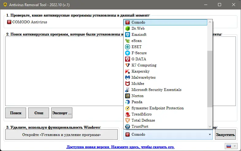 Запуск утилиты не требует установки — достаточно открыть исполняемый файл. После запуска программа автоматически сканирует систему, определяя, какой антивирус установлен в данный момент. Пользователь может выбрать запуск соответствующей утилиты деинсталляции или вручную выбрать нужный инструмент из списка. Также доступна опция поиска следов удалённых антивирусов, что полезно при подготовке системы к установке нового защитного ПО. После завершения удаления рекомендуется перезагрузить компьютер для применения изменений.