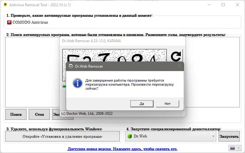 - Программа автоматически анализирует систему, определяя установленный антивирус, и предлагает соответствующую утилиту.