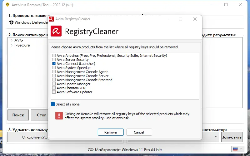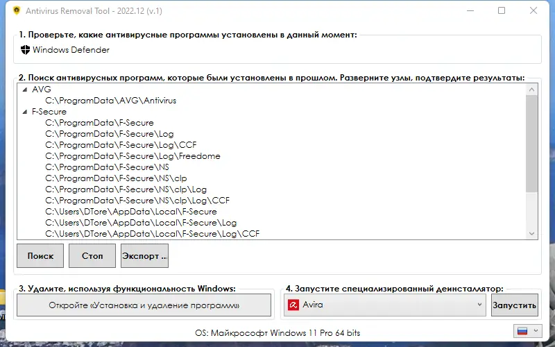 - Поддерживается деинсталляция 28 различных решений, включая продукты Avast, AVG, Bitdefender и другие.