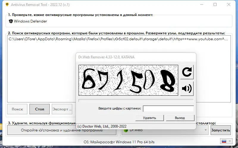 Работа с Antivirus Removal Tool