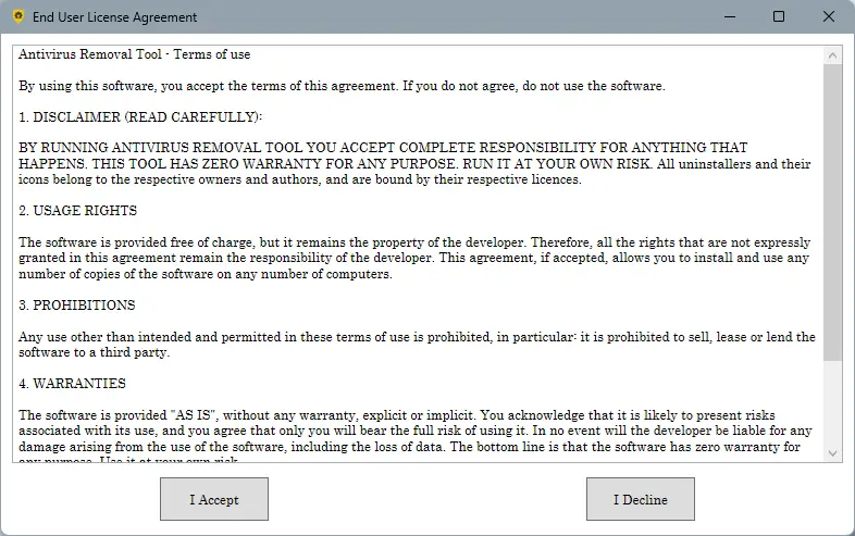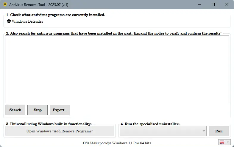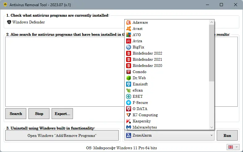 Antivirus Removal Tool — это портативное решение для полного удаления антивирусных программ и их остаточных файлов из системы. Утилита объединяет официальные деинсталляторы от ведущих разработчиков, обеспечивая чистое удаление без ручного поиска компонентов. Программа автоматически определяет установленный антивирус и предлагает соответствующее средство деинсталляции, упрощая процесс очистки системы. Также доступен сканирующий режим для поиска следов уже удалённых защитных решений, что позволяет выполнить глубокую очистку. Интерфейс интуитивно понятен, а сама утилита не требует установки. Поддерживается работа с 28 известными антивирусами, включая продукты от Bitdefender, Avast, ESET и других. Это делает инструмент универсальным выбором при смене антивирусного обеспечения. Антивирус может конфликтовать с новой защитой, если удалён не полностью, поэтому использование специализированного деинсталлятора критически важно. Портативная версия позволяет запускать утилиту с флешки без необходимости копирования на диск. Сборка регулярно обновляется, включая актуальные версии официальных утилит. Версия 2025.07 v 1 принесла улучшения в функциональность и совместимость. Программа работает в фоне, не перегружая систему, и не оставляет следов после завершения работы.