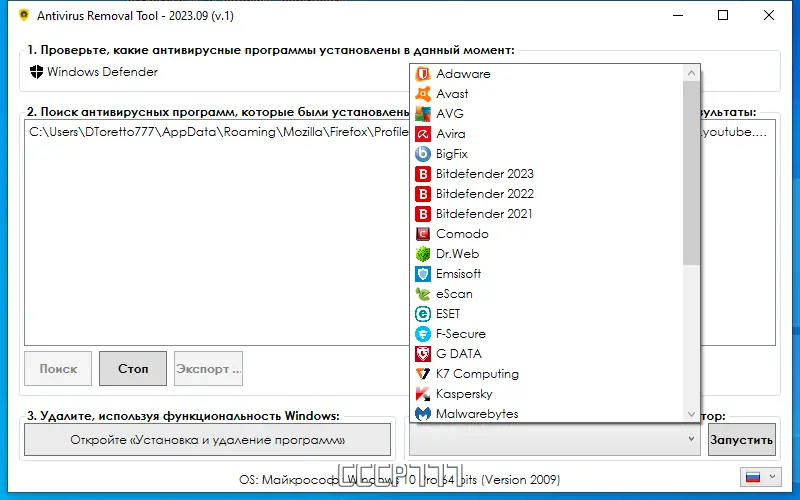 - Автоматически определяет установленный антивирус и предлагает соответствующий деинсталлятор