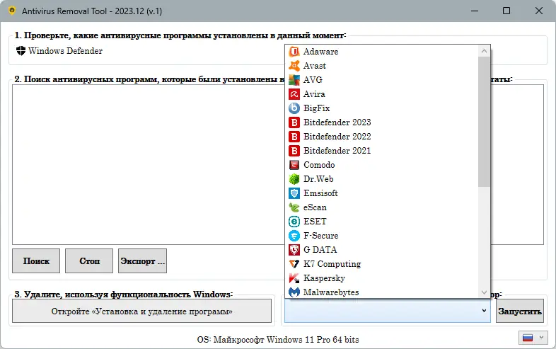 - Графическая оболочка автоматически определяет установленный антивирус и предлагает соответствующий деинсталлятор.