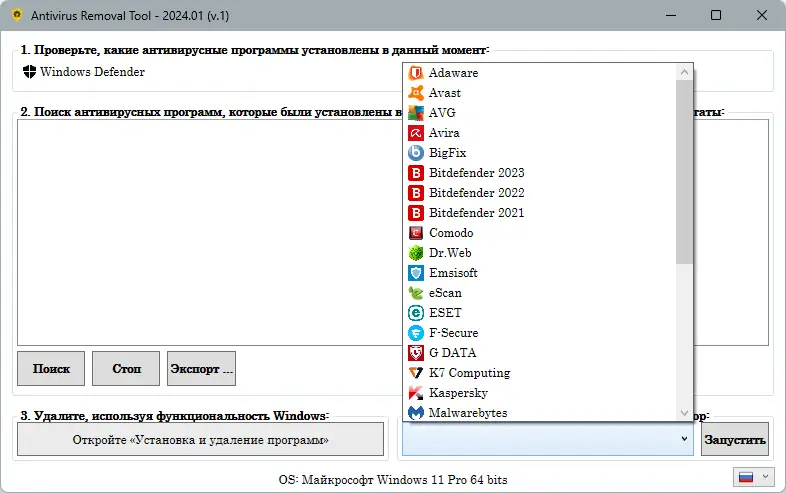 - Программа автоматически распознаёт установленный антивирус и предлагает нужный инструмент.