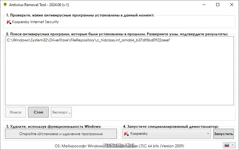- Автоматическое определение установленного антивируса позволяет быстро начать процесс деинсталляции.