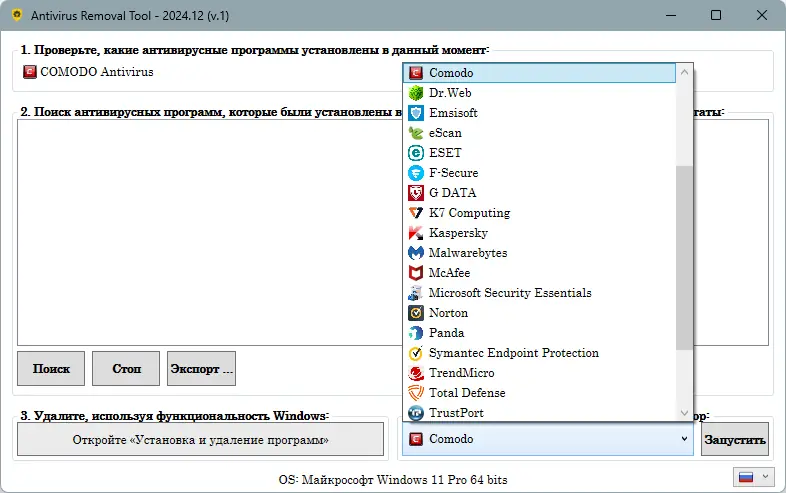 - Включает официальные утилиты удаления от 28 популярных антивирусов, включая Avast, AVG, Bitdefender и другие.