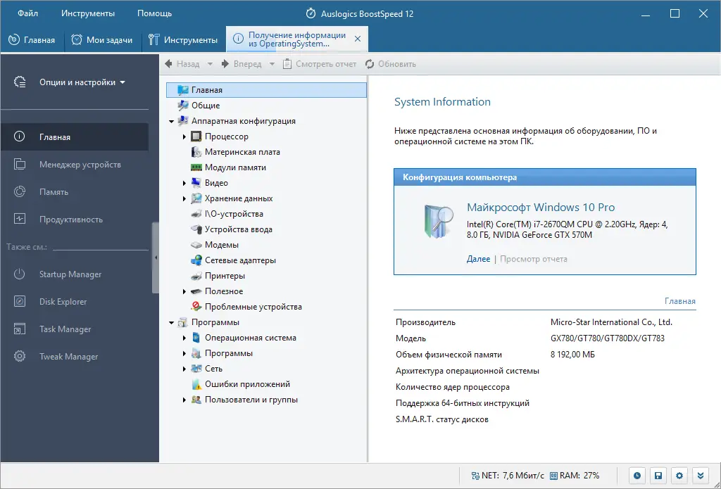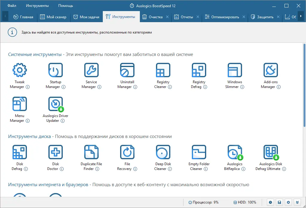- Полный набор инструментов для диагностики, очистки и настройки системы в одном интерфейсе.