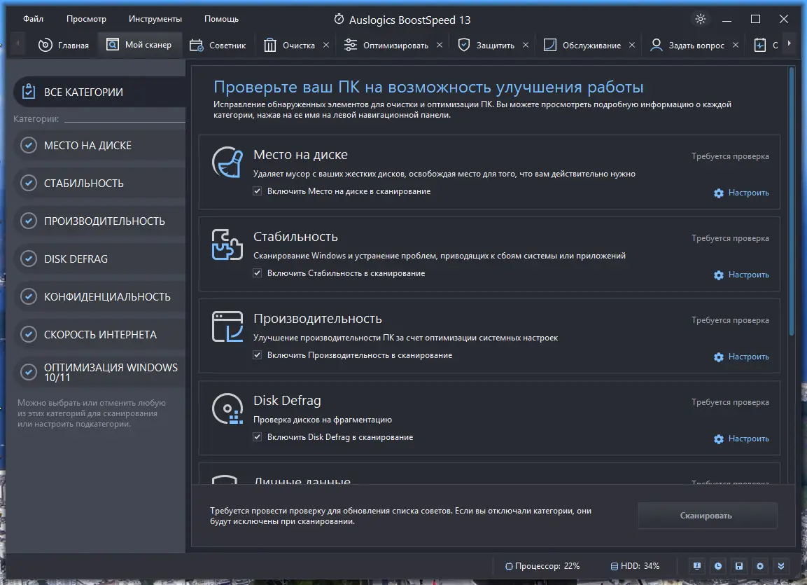 Использование программы не требует специальных знаний: после запуска отображается панель с основными модулями, сгруппированными по функциональному назначению. Пользователь может запустить быструю проверку, которая автоматически выявит проблемы в системе, или вручную выбрать нужный инструмент. Каждая утилита сопровождается подробным описанием и рекомендациями, что упрощает процесс настройки. Интерфейс переведён на русский язык, а визуальные индикаторы отражают текущее состояние системы, включая уровень фрагментации, объём занятого места и количество ошибок.