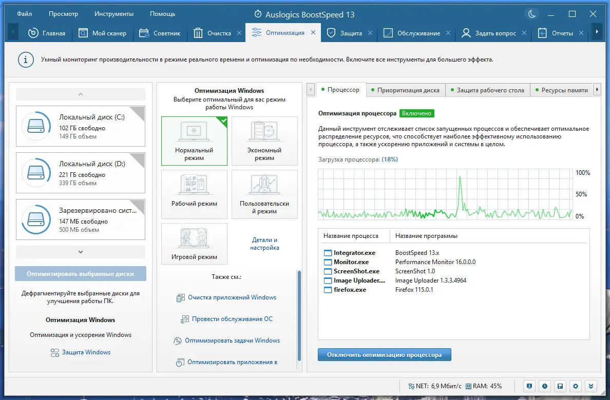 Программа Auslogics BoostSpeed помогает ускорить работу компьютера за счёт комплексной оптимизации системы. Она очищает реестр, дефрагментирует диски, удаляет временные файлы, настраивает автозагрузку и повышает производительность интернет-соединения. Решение подходит как для новичков, так и для опытных пользователей, стремящихся продлить срок службы своего ПК без лишних усилий.