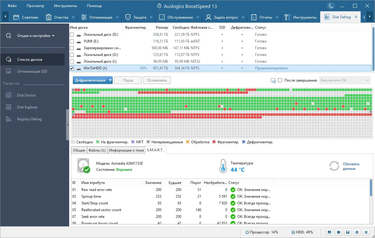 - Позволяет провести дефрагментацию дисков и реестра для улучшения доступа к файлам.