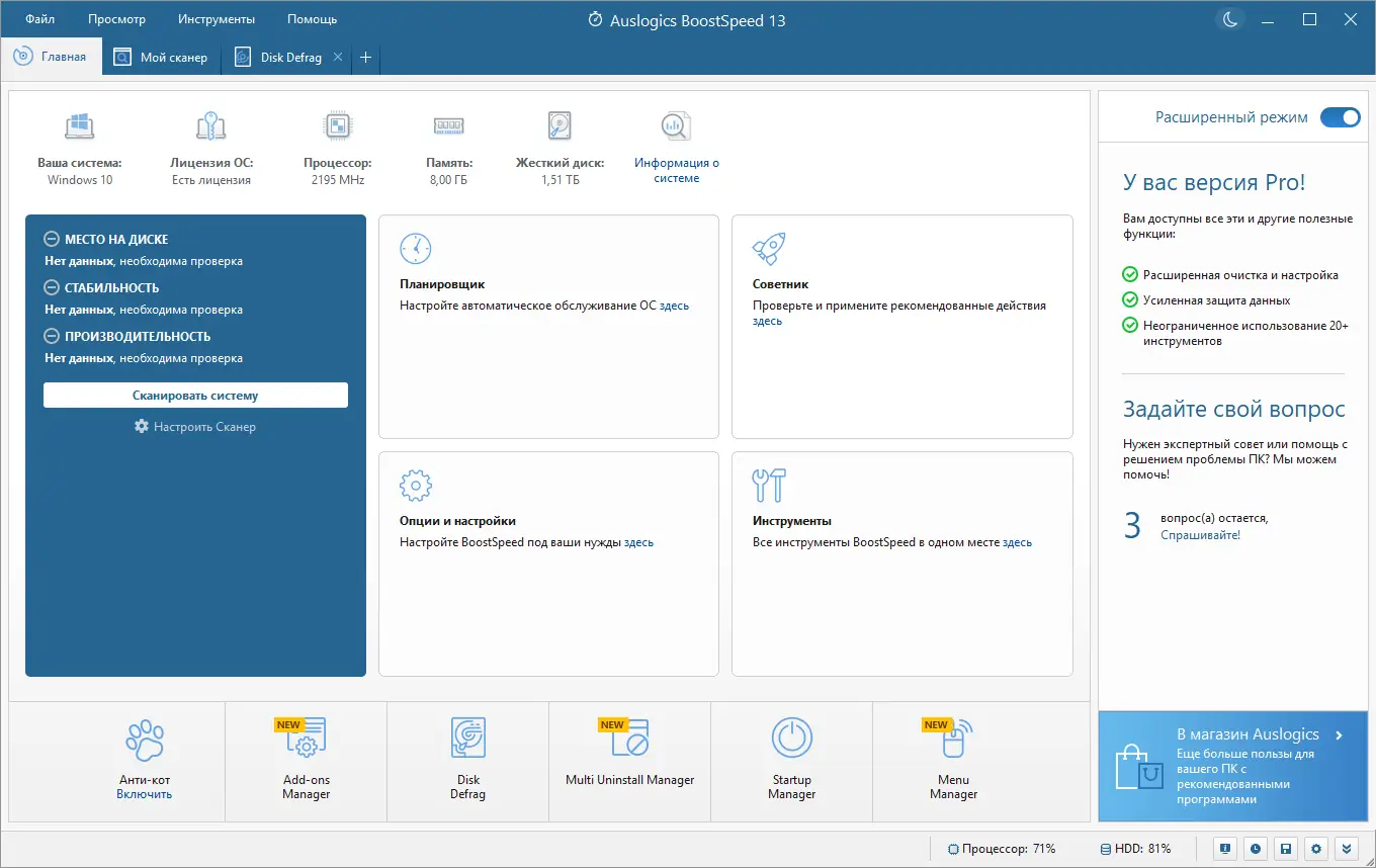 Auslogics BoostSpeed — это мощный инструмент для глубокой оптимизации операционной системы Windows, объединяющий десятки утилит в одном интерфейсе. Программа помогает ускорить работу компьютера за счёт очистки системы от мусора, дефрагментации дисков и реестра, настройки автозагрузки, управления службами и повышения приватности. С её помощью пользователь может вернуть утерянную производительность, освободить место на диске и обеспечить стабильную работу системы.