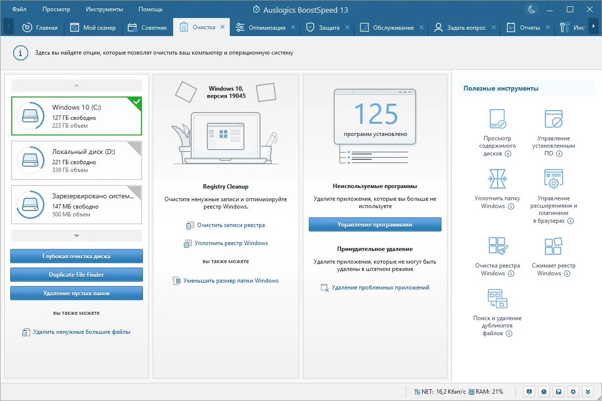 Программа Auslogics BoostSpeed предлагает всесторонний подход к обслуживанию операционной системы. Она позволяет выявлять и устранять факторы, снижающие производительность, включая накопление временных файлов, фрагментацию дисков, ошибки в реестре и избыточные автозагрузки. Каждый инструмент в наборе работает точно и безопасно, обеспечивая стабильность системы после внесения изменений. Интерфейс адаптирован под русскоязычных пользователей, что упрощает навигацию и понимание процессов.