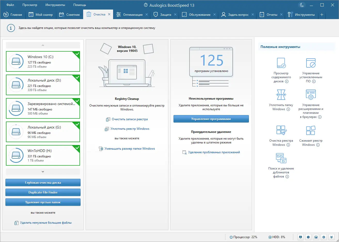 - Программа обеспечивает глубокую очистку дисков от временных и ненужных файлов, включая кэш браузеров, логи и остатки удалённых приложений.