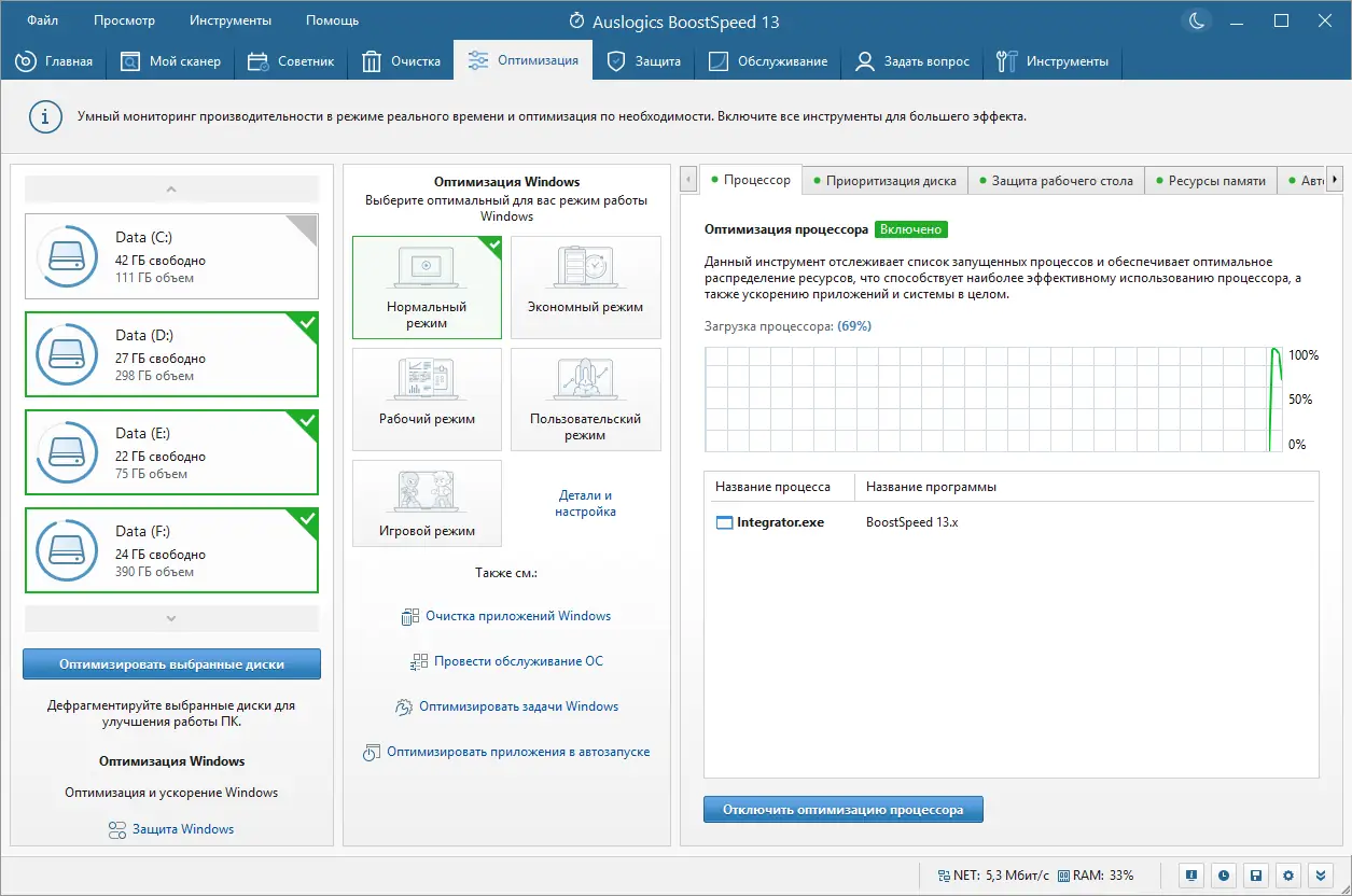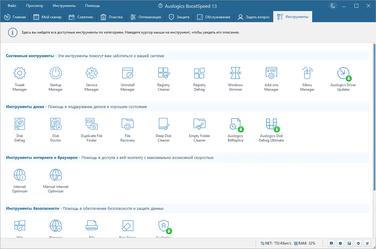 Auslogics BoostSpeed — это мощный инструмент для комплексной оптимизации системы, который помогает очистить реестр, дефрагментировать диски, ускорить интернет и восстановить случайно удалённые файлы. Программа объединяет множество утилит для тонкой настройки Windows, повышения производительности и контроля за состоянием компьютера.