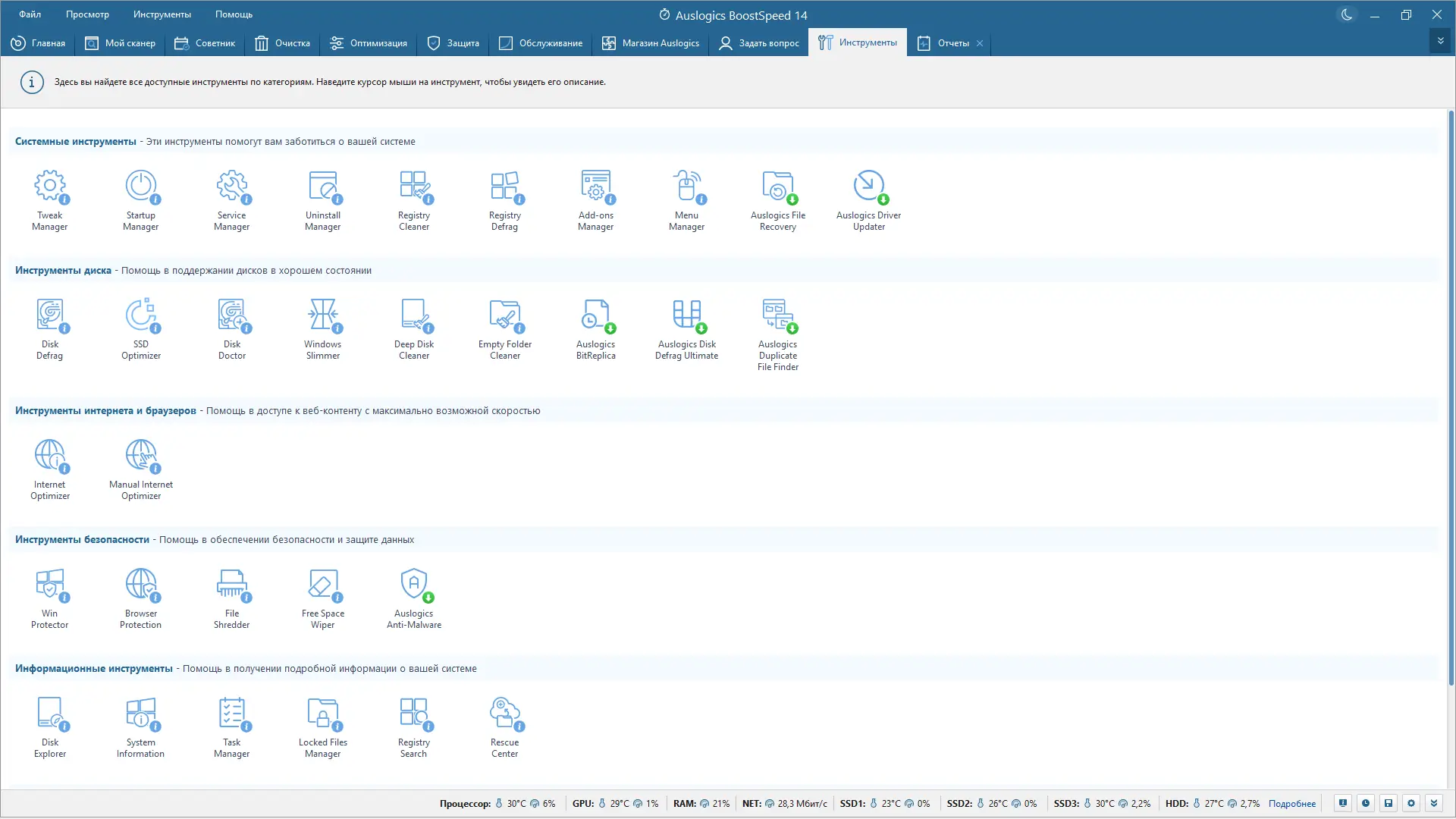 - Инструменты для очистки дисков и реестра от ненужных файлов и записей.