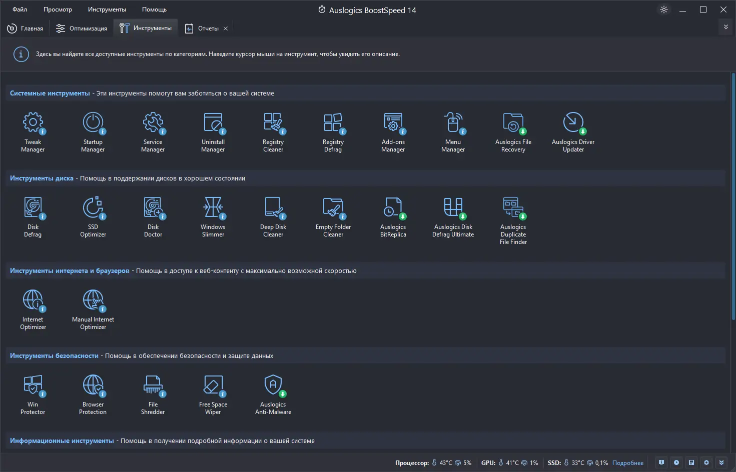 Auslogics BoostSpeed разработан как многофункциональный твикер, способный провести полную диагностику системы и устранить всё, что замедляет её работу. Программа автоматически сканирует жёсткие диски, реестр, параметры автозагрузки, сетевые настройки и другие критически важные компоненты операционной системы. На основе результатов анализа она предлагает оптимизировать систему, удалив ненужные файлы, исправив ошибки и настроив параметры под конкретное «железо» и тип интернет-подключения.