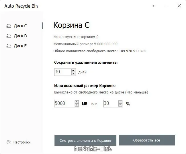 - Автоматическое удаление активируется при достижении корзиной определённого объёма
