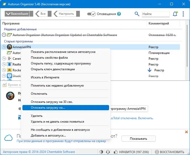 - Функция отложенного запуска позволяет задать таймер, по истечении которого приложение начнёт работать, снижая нагрузку на систему при старте.